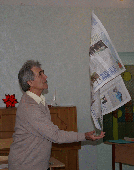 Это уже VI подобный семинар, многие участники успели за это время познакомиться и наладить методическое и человеческое сотрудничество. Поэтому после непродолжительных вступлений на семинаре сразу перешли к довольно насыщенному перечню выступлений и мастер-классов. В начале своего выступления Николай Григорьевич обратил внимание участников на важность для осваивающих оригами, особенно школьников средних и младших классов, предварительно познакомиться со свойствами бумаги, как строительного средства. А чтобы такое знакомство проходило более наглядно, живо и увлекательно, тоже приходиться придумывать и изобретать. На снимке: Николай Григорьевич показывает, как можно сделать так, чтобы в течение нескольких секунд можно было удерживать газету на одном пальце руки – и, конечно, без единой капельки клея! |