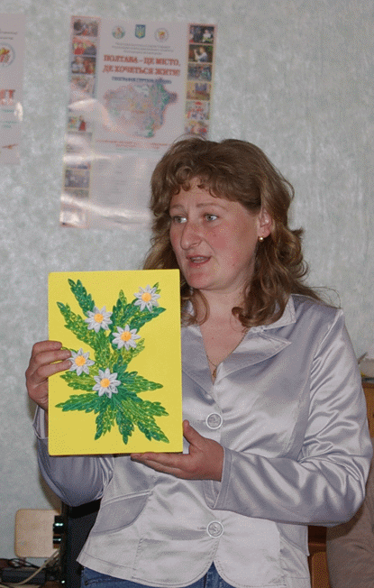 Наталия Ивановна Билык ведёт кружок оригами черкасской станции юных техников. Её сообщение было посвящено приёмам изготовления поделок с помощью бумагокручения (по-английски,