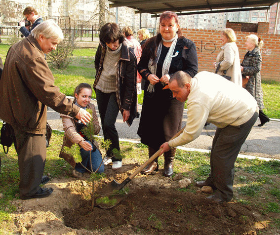 И стар и млад ощущают значимость события и вносят посильный вклад в его осуществление. Содружества по посадке каждой сосенки собирались по взаимному желанию самих участников. |